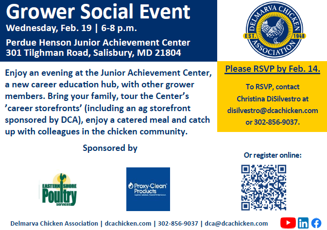Enjoy an evening at the Junior Achievement Center, a new career education facility sponsored by Delmarva Chicken Association, with other grower members. Bring your family, enjoy a catered meal and catch up with colleagues in Delmarva's chicken community.